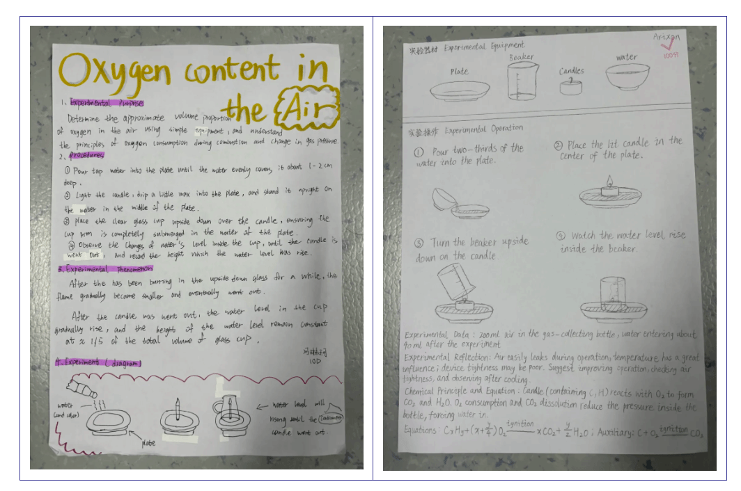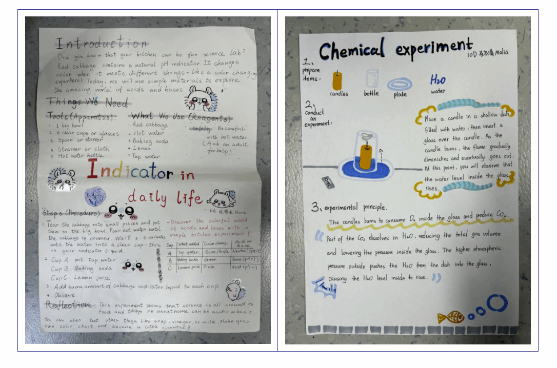 实验之余,大家也没落下学习任务,纷纷拿起画笔,将实验与课堂所学手绘成手抄报。手抄报上,既有对实验步骤的清晰记录,也有对化学原理的详细解读,密密麻麻的知识点凝结着认真的态度,在绘制过程中进一步加深了对知识的理解,真正做到了 “玩中学、学中固”。