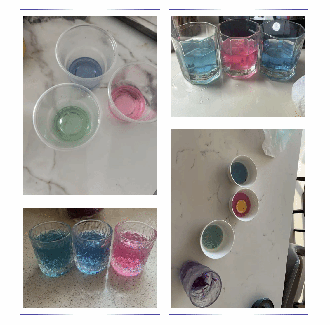 紫甘蓝摇身一变,成了神奇的 “酸碱侦探”,按照实验步骤,同学们先把紫甘蓝切丝泡入热水,提取出富含花青素的 “魔法水”。接着将这份 “魔法水” 分别倒入糖水、柠檬水、苏打水等液体中。原本无色的液体瞬间换上 “彩装”:遇到酸性的白醋、柠檬水就变成鲜艳的红色,碰到碱性的苏打水、碱水就转为清新的蓝色,在中性的白开水中则保持淡雅的紫色。看着色彩的奇妙变化,大家直观感受到了酸碱反应的奥秘,原来生活里常见的紫甘蓝,藏着这么有趣的化学原理!