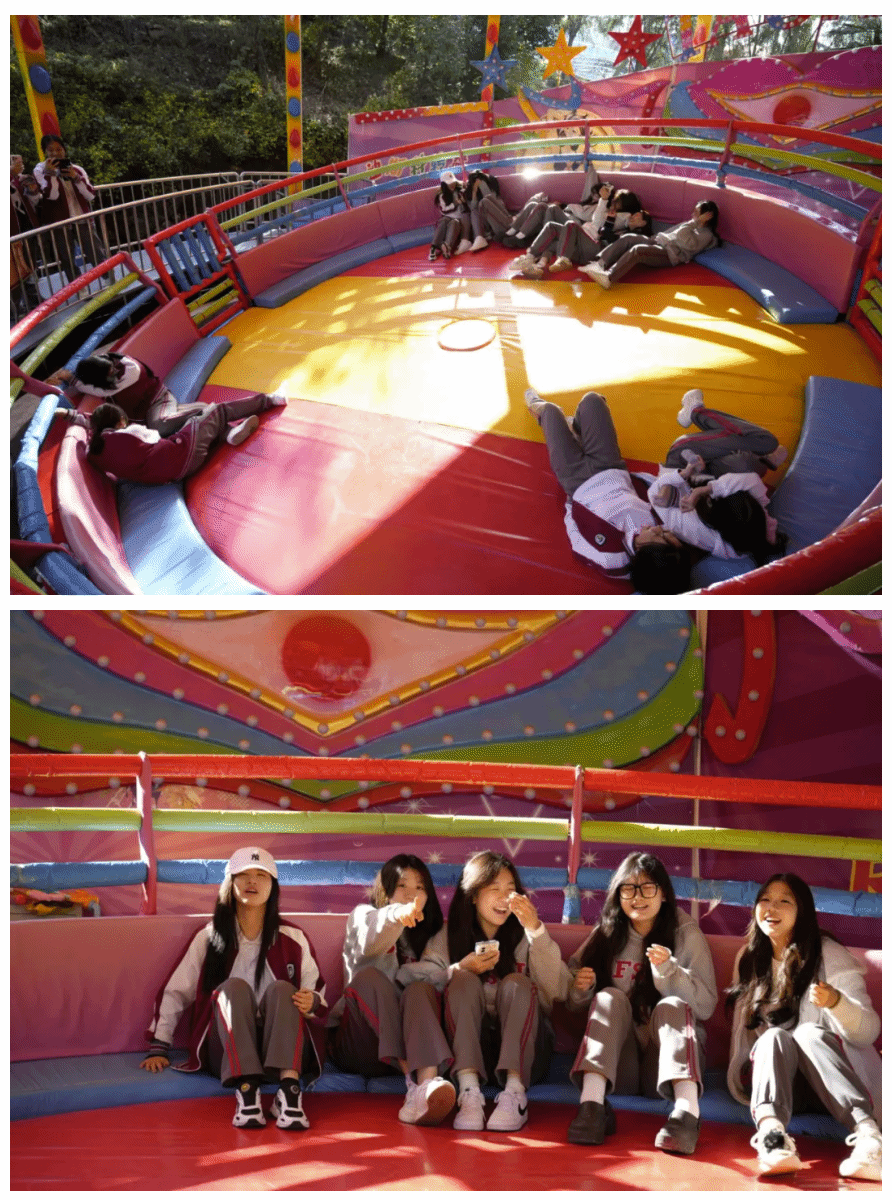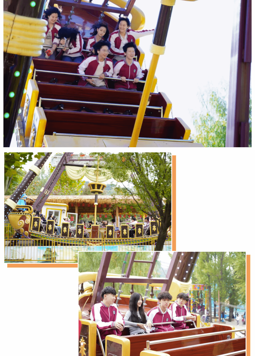 刚踏入园区,同学们便活力满满地在老师带领下开启了“秋日探险”。迪斯科转盘的旋转、海盗船的起伏、彩虹滑道的飞驰、摩托艇的湖上穿梭......各类项目让大家玩得不亦乐乎,笑声与欢呼声不断。