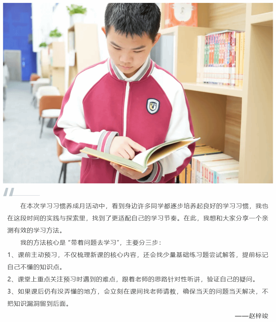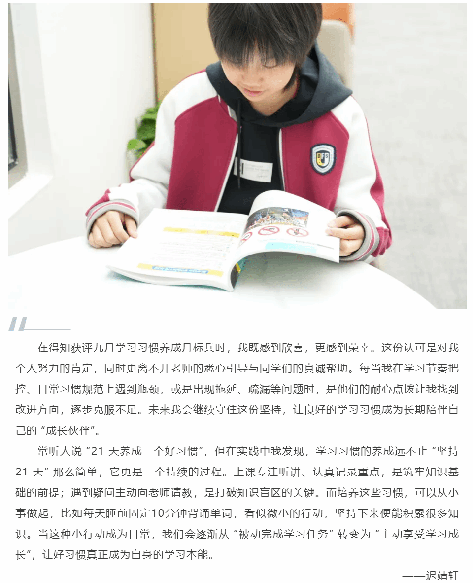 清晨的阳光洒满校园,笔尖在作业本上沙沙作响,为期一个月的 “学习习惯月” 活动已悄然落下帷幕。在这段充满坚持与成长的时光里,同学们以好习惯为帆,以坚持为桨,在知识的海洋中不断前行,各学科领域都涌现出了一大批亮眼成果,更有同学脱颖而出,用亲身经历诉说着好习惯带来的蜕变。