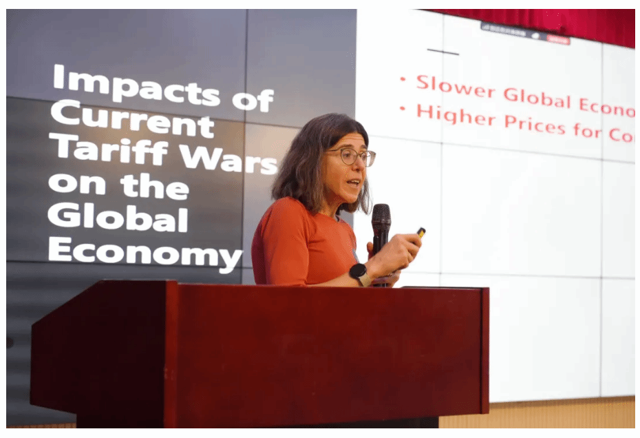 Emiliya Lazarova教授围绕“What is the impact of the current global 'tariff wars' on the global economy?”(当前全球“关税战”对全球经济有何影响?)这一主题,展开了深入而系统的讲解。她从经济学的基本概念入手,从多个角度分析了全球“关税战”的影响。