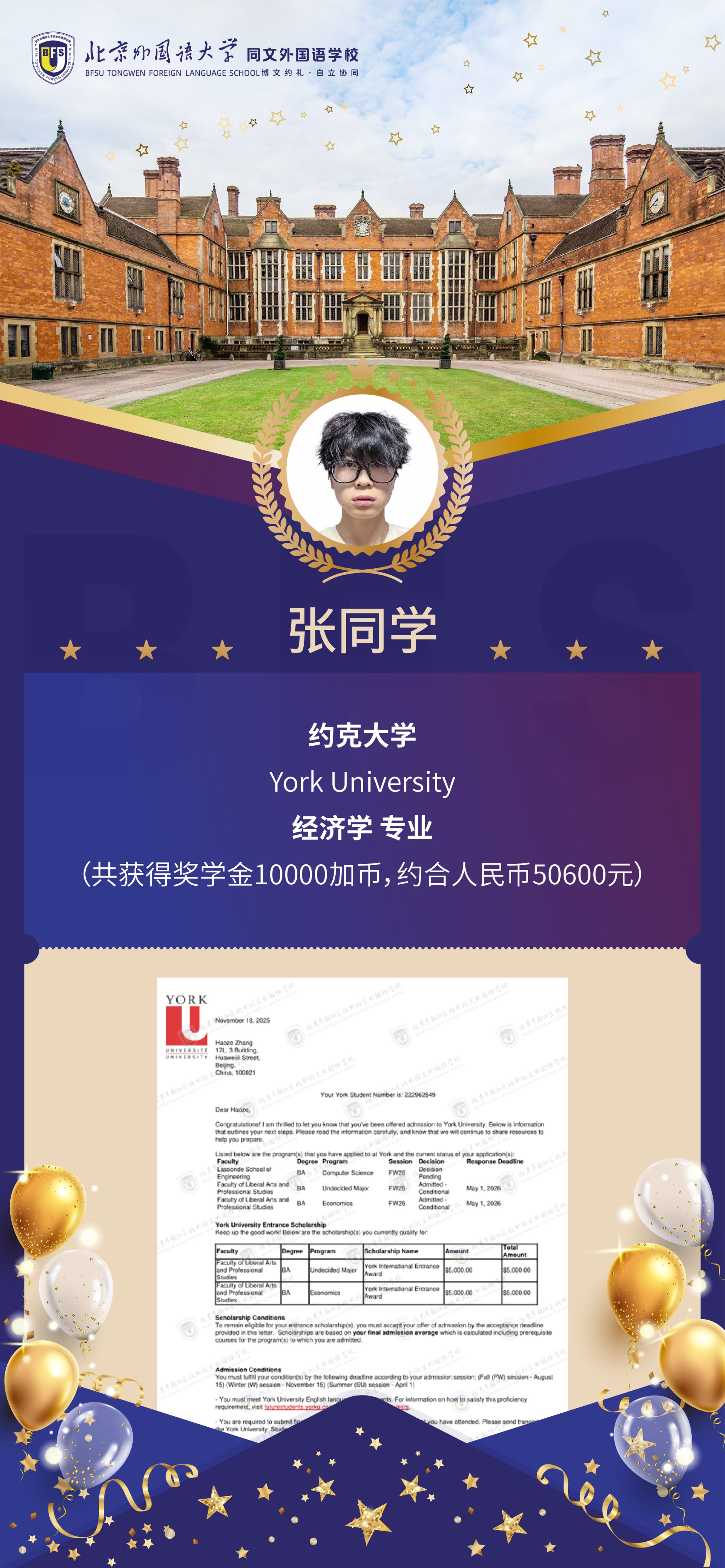 这份沉甸甸的录取成果,离不开每一位学子的奋力拼搏,更植根于北外同文深厚的教育积淀。北外同文将始终以个性化升学指导为支撑,以全方位素养培育为目标,为学子们搭建起通往世界舞台的坚实桥梁。目前,海外大学申请季仍在进行中,期待更多捷报传来!