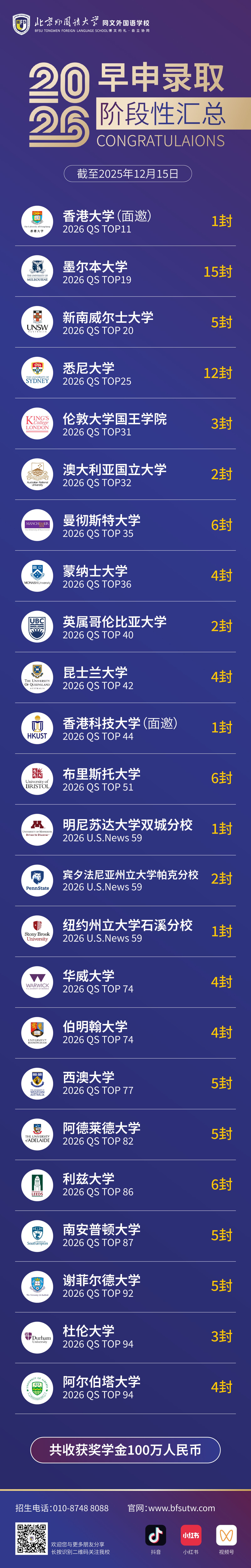 截至目前,学子已成功收获百封世界百强名校录取通知书及面试邀请,涵盖了英美澳加及亚洲等多个主流留学目的地。学子们凭借其卓越的学术水平和全面的综合素质,累计获得超过100万元人民币的奖学金,实现了荣誉与资助的双重肯定!
