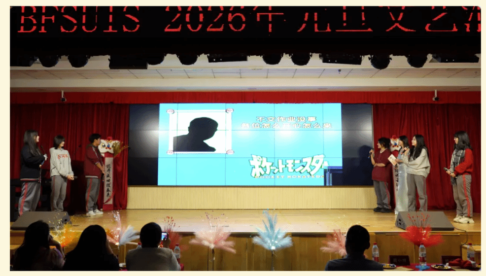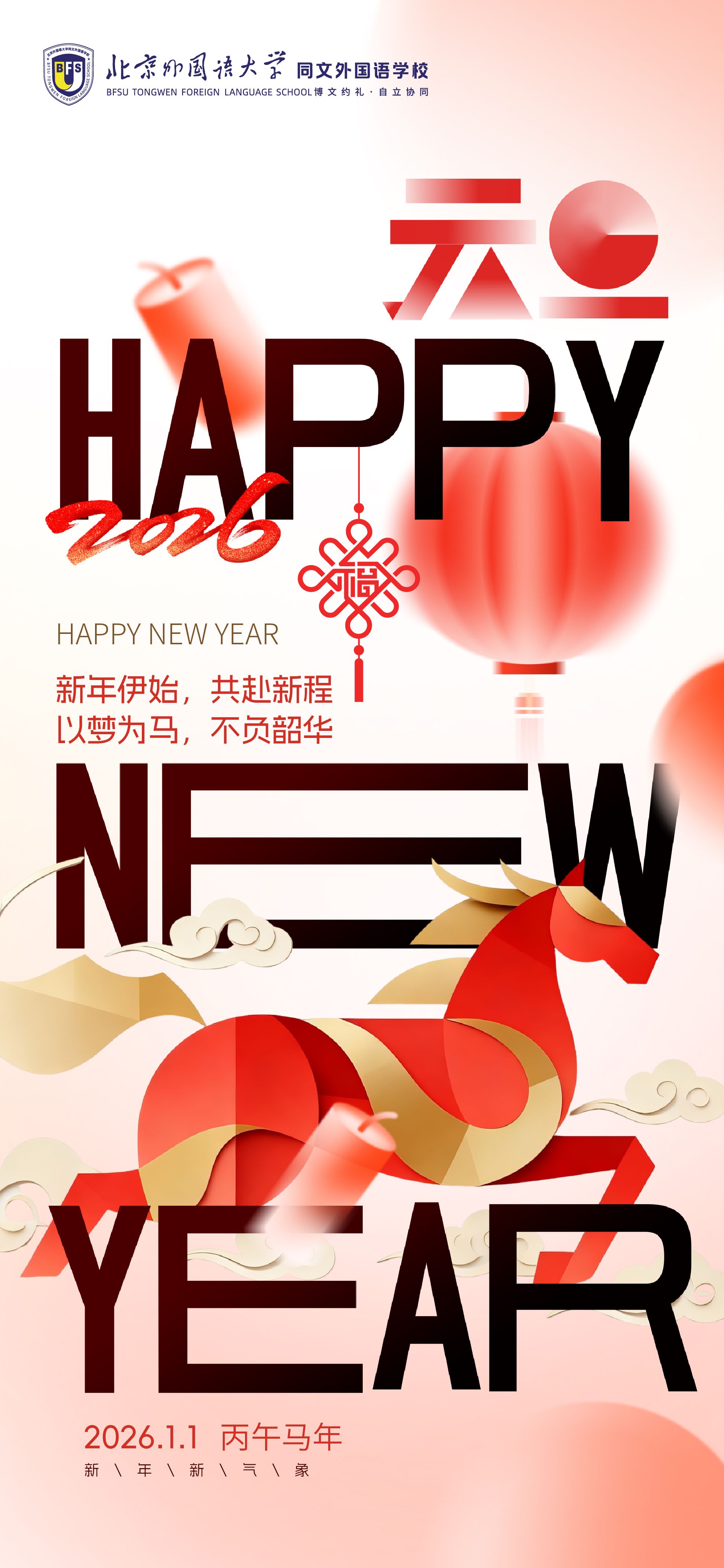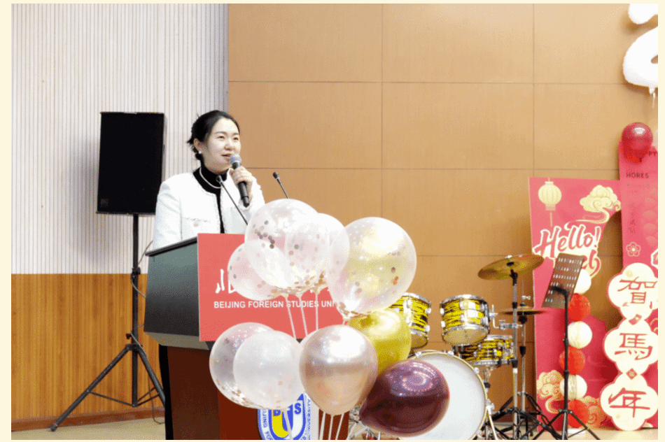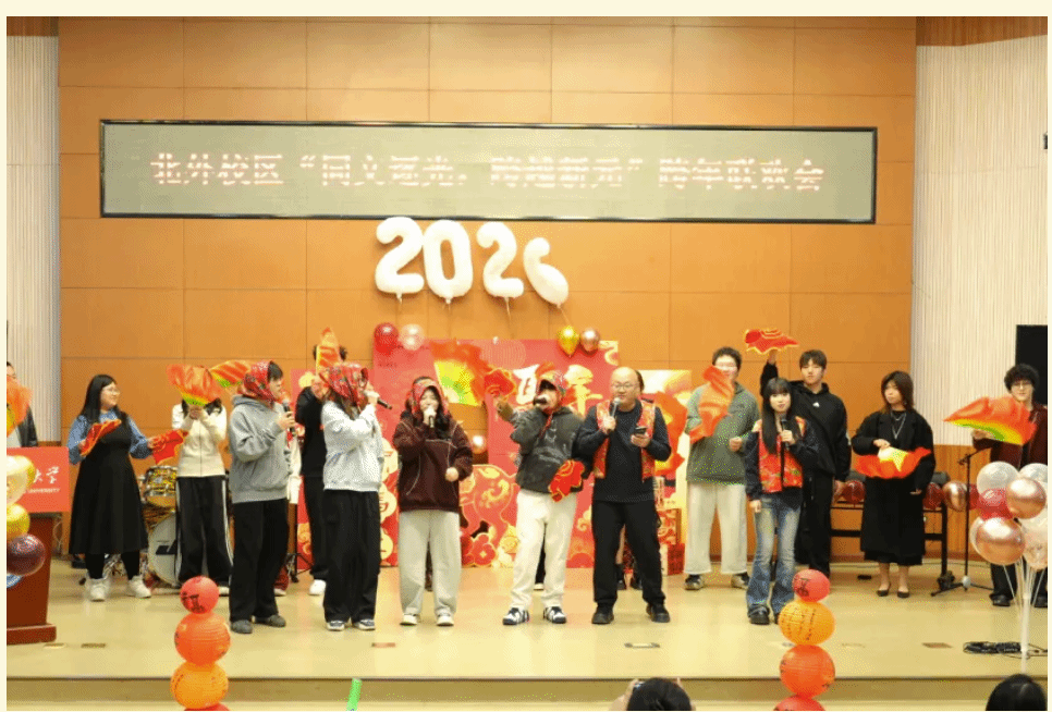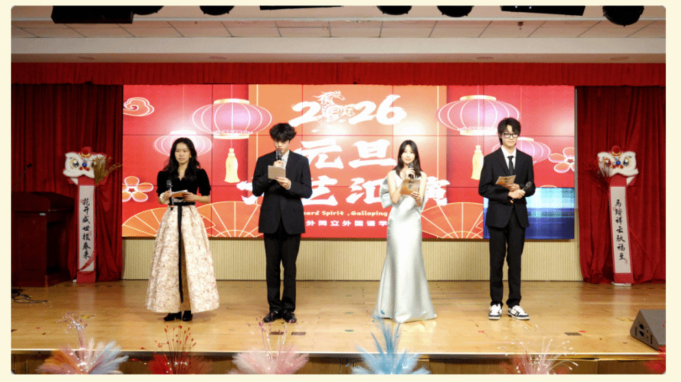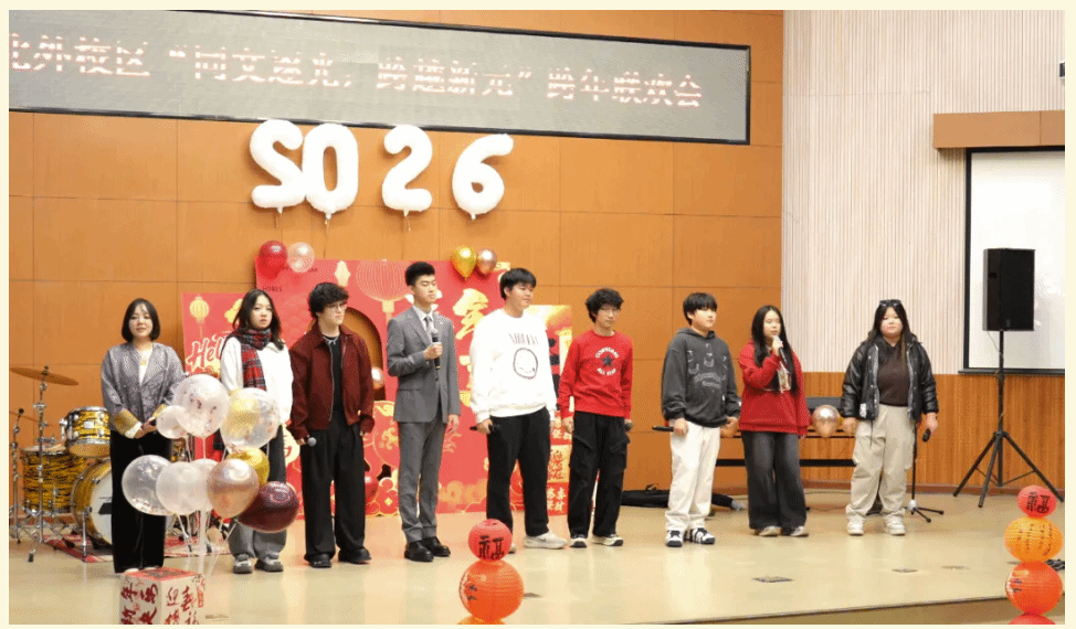 “这一年,收获满满且亮点纷呈。老师们深耕课堂,把北外的优质资源转化为育人实效。同学们不仅精进学业,也展现了聪明才智;听海外大学招生官、教授讲座,拓宽认知;在研学旅行、春秋游中亲近自然,增进情谊。既完成了学业上的进步,也练就了本领,开阔了眼界。新的一年,愿你们保持对知识的渴望和对世界的好奇,在学习中感悟文化魅力,在实践中探索、锤炼过硬本领,在合作包容中收获真挚友谊。不管离我们而去的这一年有多少喜悦、欢乐、遗憾或是痛苦,此刻都抛到身后。祝愿同学们在新的一年中身体健康,学业有成。2026,马到成功!”