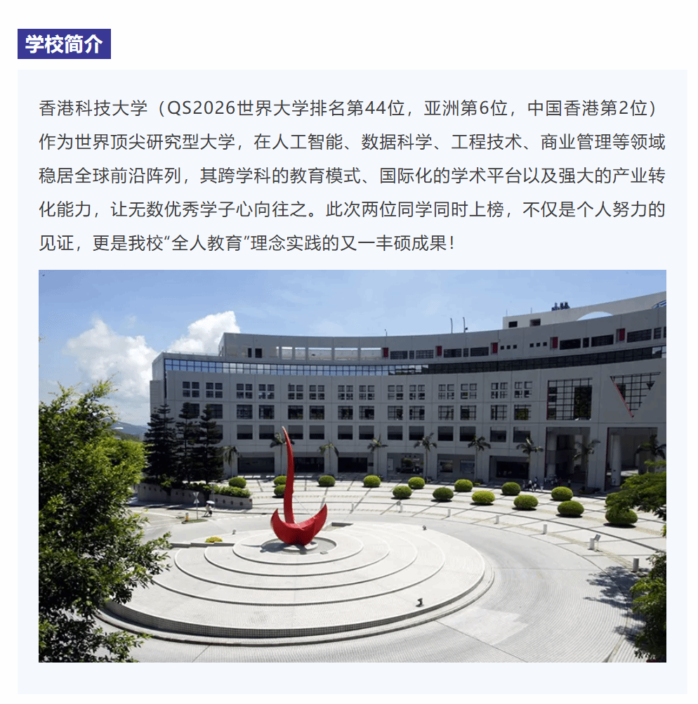 捷报再传!在2026升学申请季的激烈角逐中,我校学子凭借扎实的学术功底、卓越的综合素养,不负众望、再创辉煌——两位同学成功斩获香港科技大学(QS2026世界大学排名第44位,亚洲第6位,中国香港第2位)本科录取offer!双重喜悦,荣耀共享!
